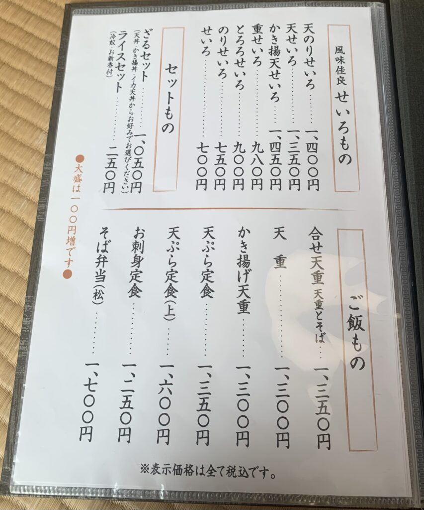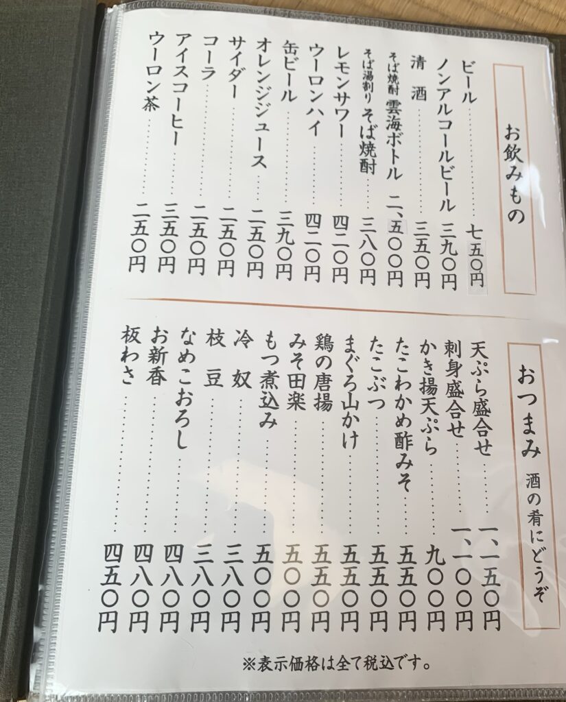 昔からあるお店で、お蕎麦の他にもうどんやカツ丼、刺身、天丼など和食関係が色々あり、目移りしてしまう品数があります。