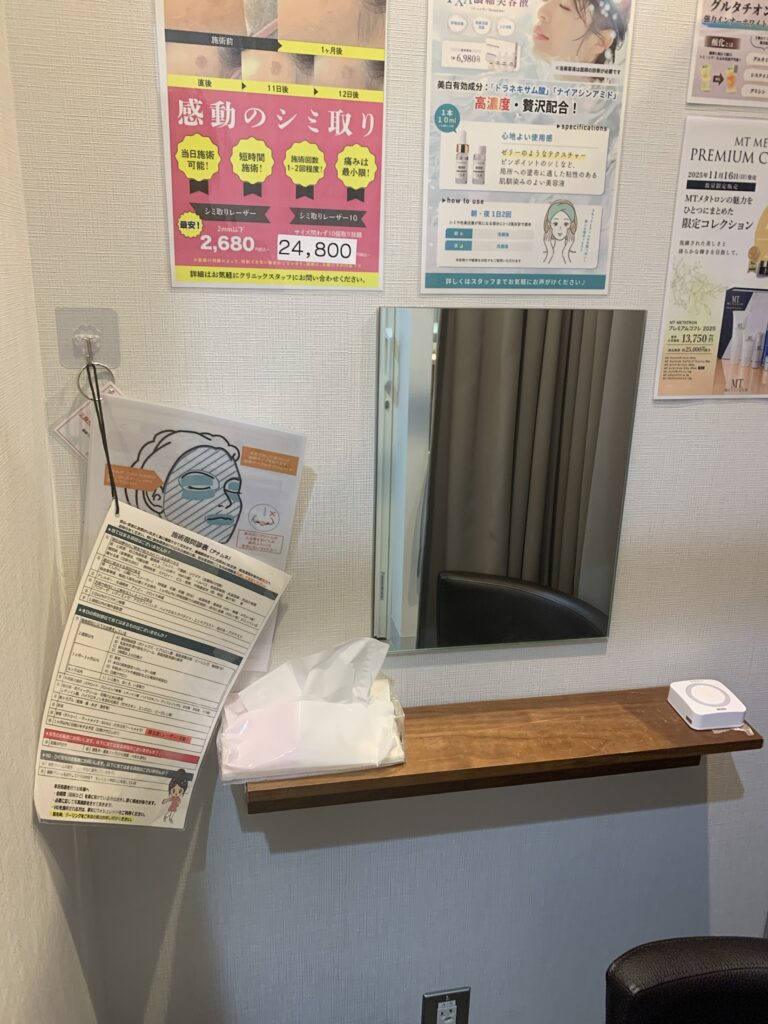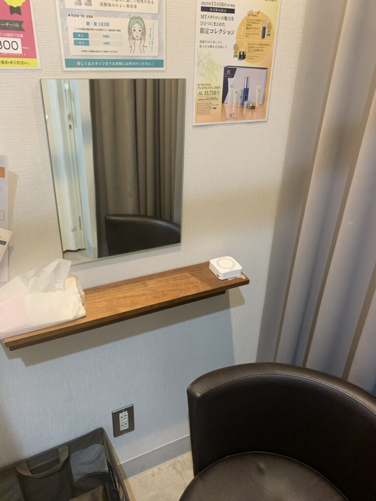 施術後に赤みなどが出てしまった場合は、別室(カーテンで仕切られている化粧ブース)に移動して氷で冷やす事が出来ます。