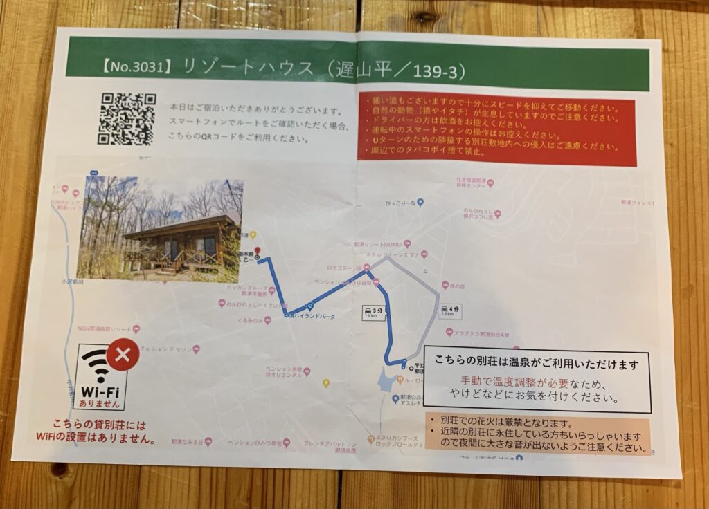 | 貸別荘移動 | ・チェックイン時に自分達が宿泊する貸別荘迄の案内図を渡されますので、GoogleMAPを使用し貸別荘まで移動します。 |