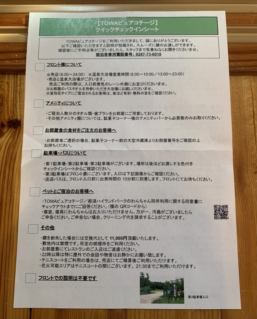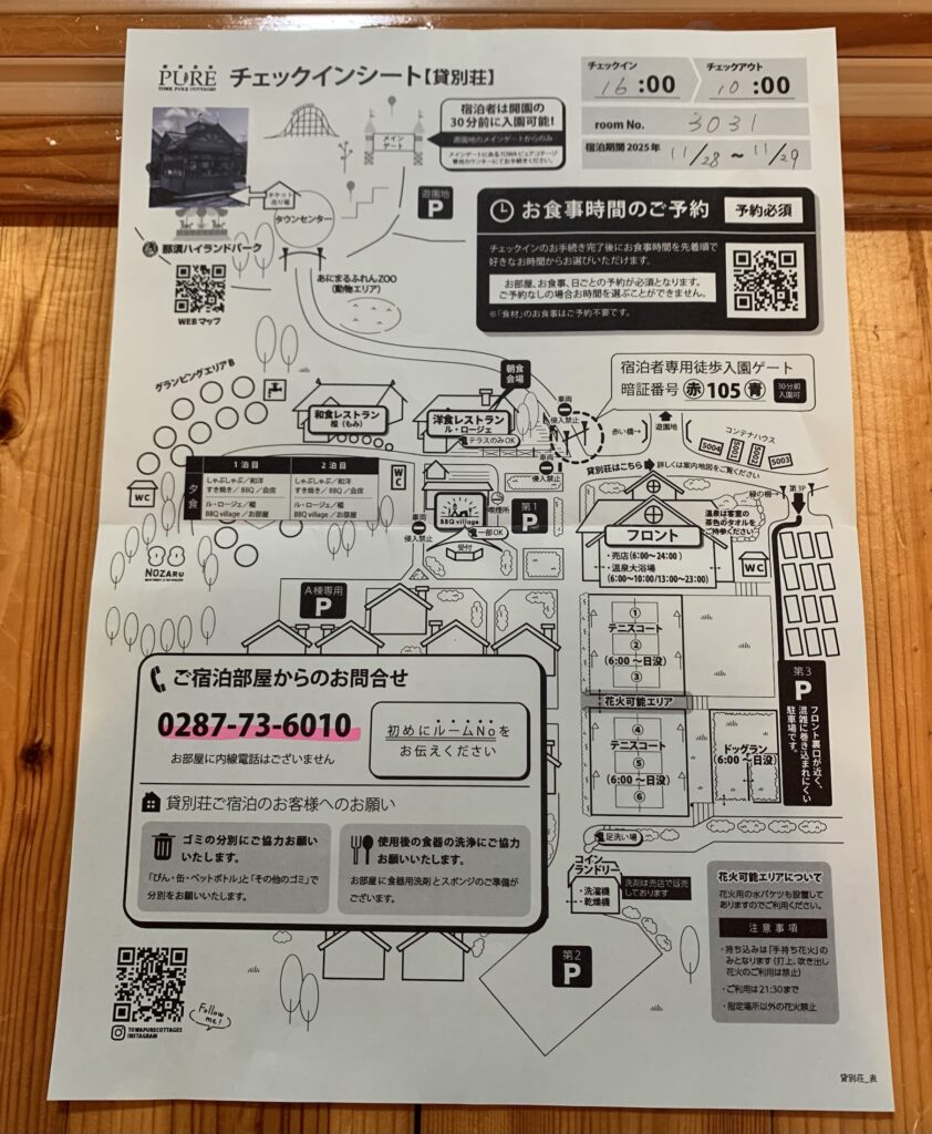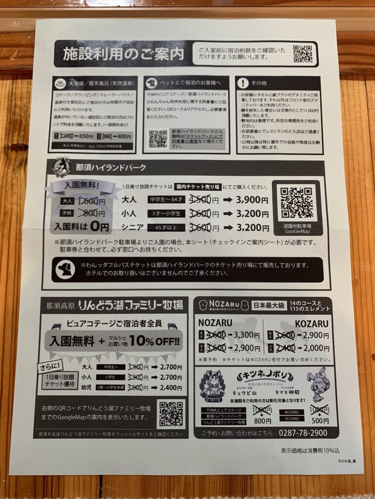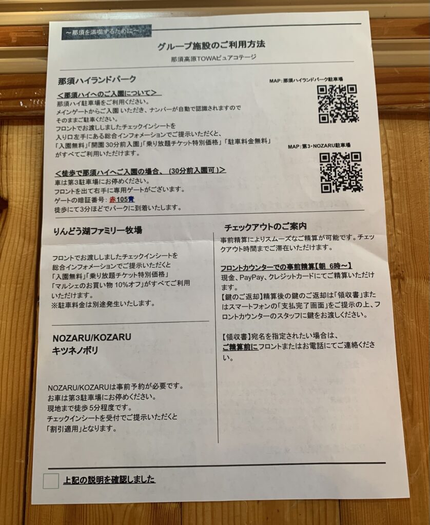 ・TOWA PURE COTTAGES【トーワピュアコテージ】のチェックイン~チェックアウト迄の手順 ・宿泊者割引特典【那須ハイランドパーク・りんどう湖ファミリー牧場・NOZARU】 |