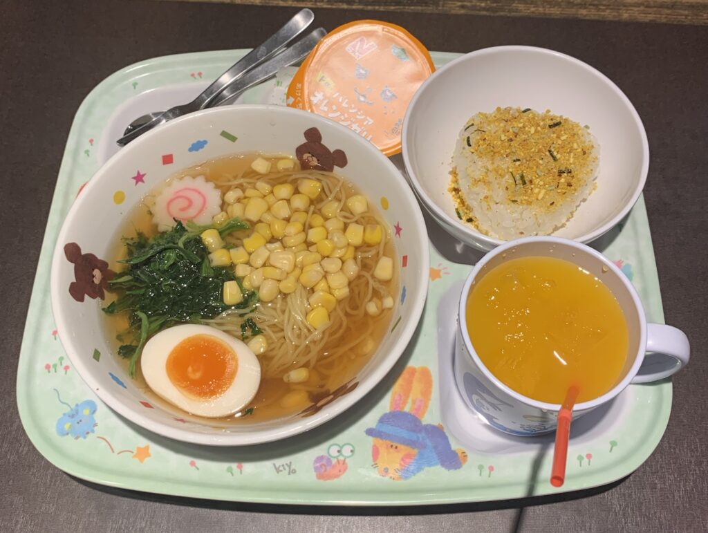 | ・しょうゆらーめん ・ふりかけおにぎり ・オレンジゼリー ・オレンジジュース ・ガチャガチャコイン |