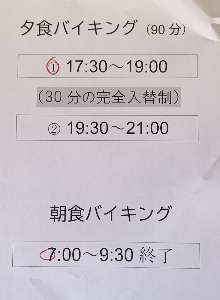 朝食バイキングは時間の希望などはありませんが、夕食バイキングに関しては2部制となっておりチェックイン時に希望の時間を選択する事が出来ます。