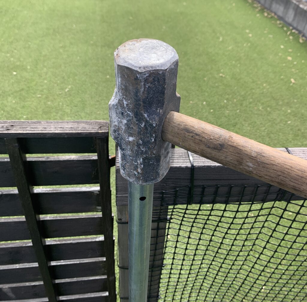 フェンスを取り付ける為の杭をハンマーを使用して打ち込みます。
