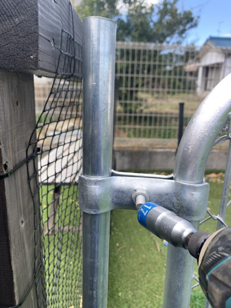 右側の杭に90°になるよう左側に出入口フェンスを取り付けます。