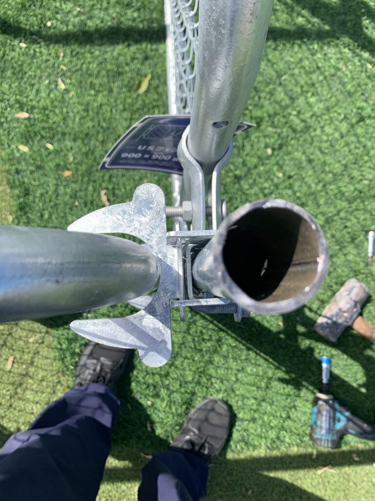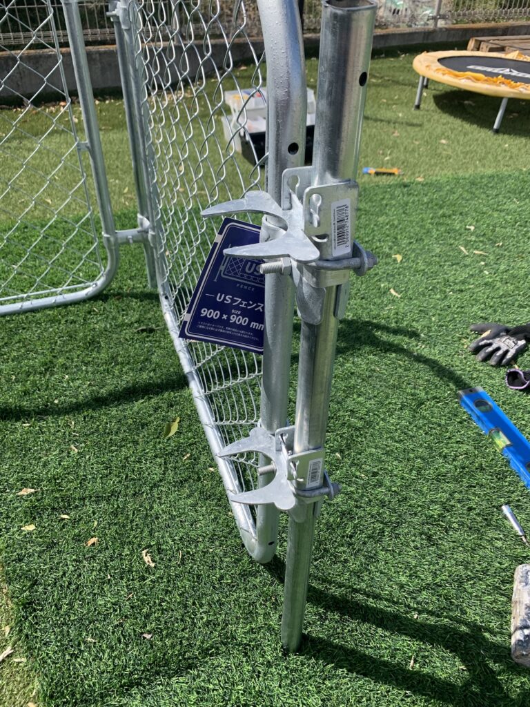 取り付け金具を使い杭とフェンスを取り付けていきます。