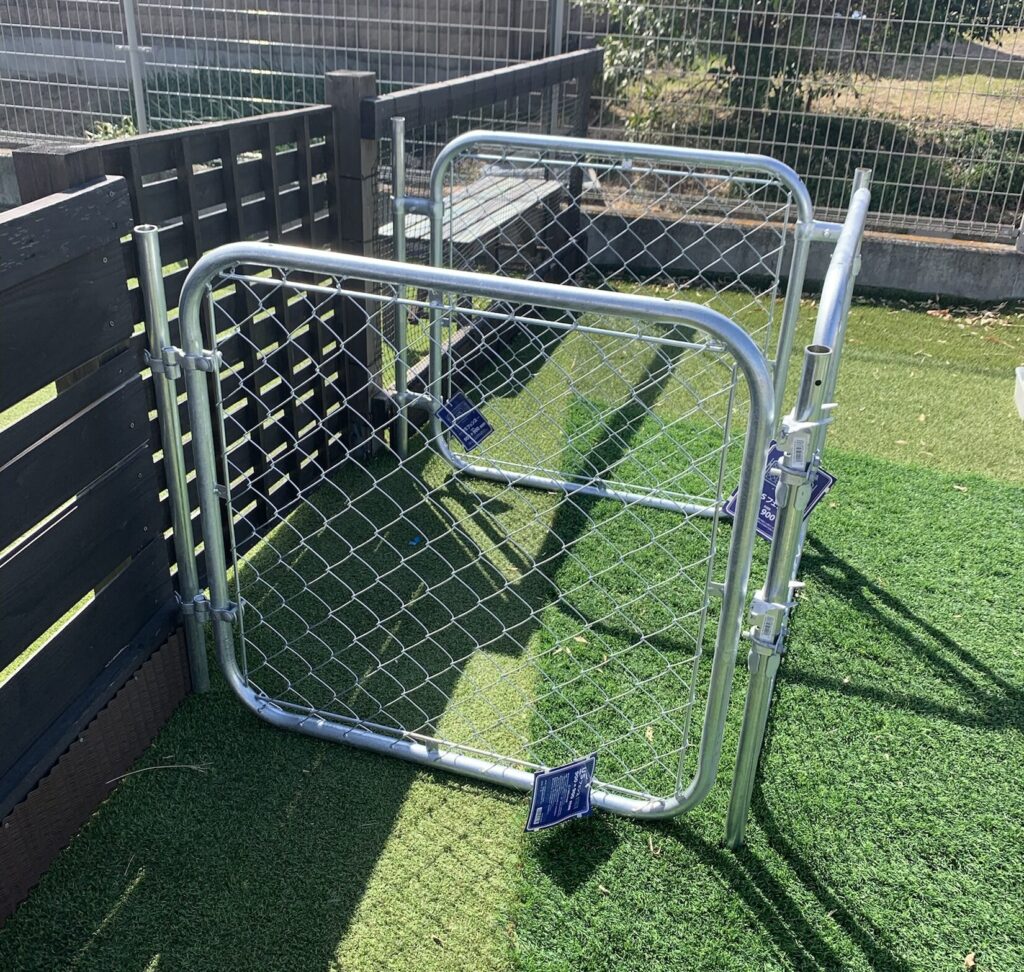 息子とチワギーがドックランで遊んでいた際、息子が入口を少し開けた瞬間犬が脱走してしまい『車に引かれたらどうしよう』とぞっとした経験から、ドックランを運営している店舗なので導入している2重扉を素人なりに真似して設置しましたので、アメリカンフェンスによる2重扉の設置方法3点をご紹介します。