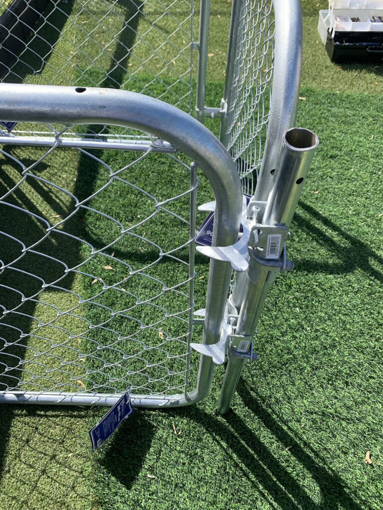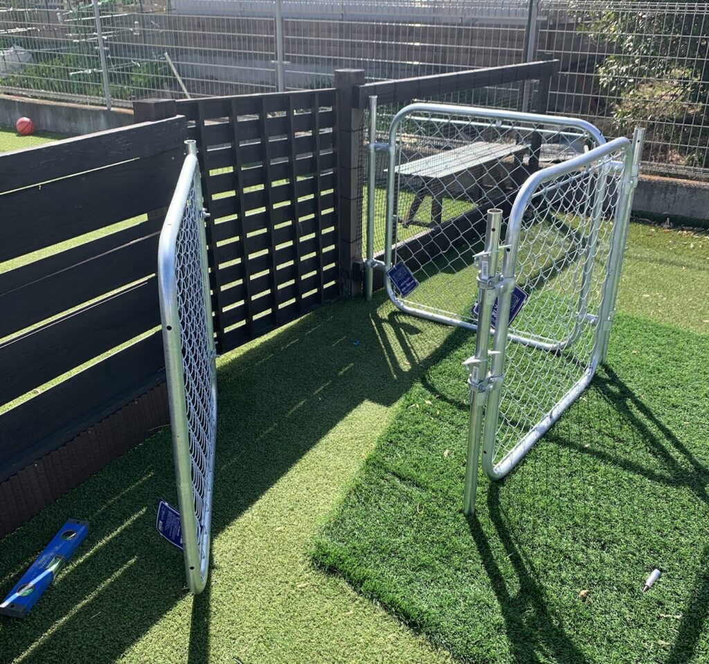 扉の前にアメリカンフェンスで覆う事により脱走防止対策の完了です。